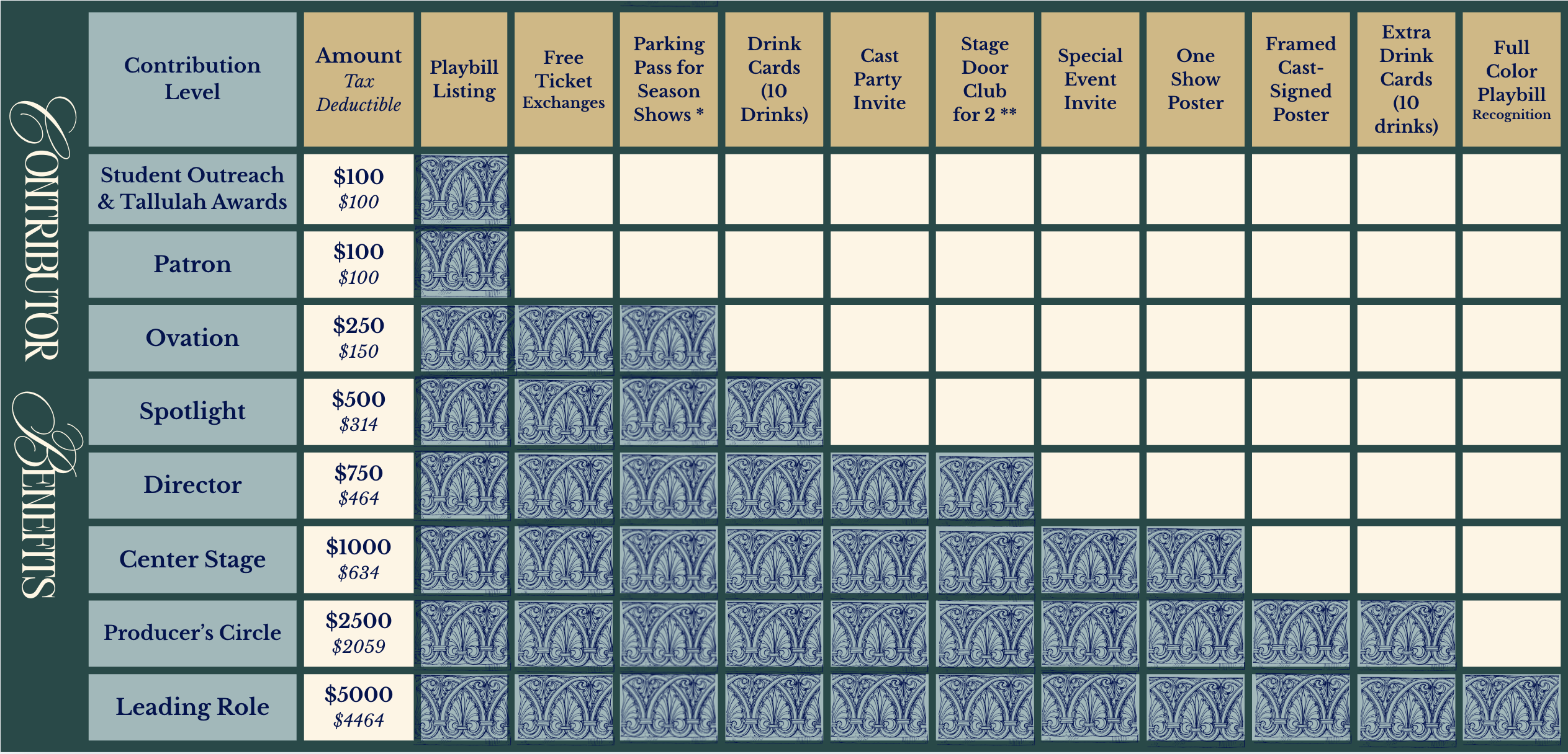 ** Stage door club is a pre-show event prior to all performances with table seating, themed heavy Hors d’oeuvres, and a bar. Additional passes are $100/person for the season and can only be purchased by current stage door club members.
